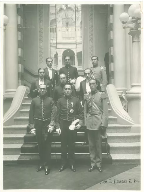 Retrato grupal de hombres de edad adulta con vestimenta elegante. Posan, primera fila sentados y segunda fila de pie, en salón alfombrado con dos espejos lámpara y mampara vidriada. En ángulo inferior derecho de la fotografía se observan dos sillas con brazo tapizadas con motivos florales.