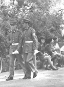 Hombres de edad madura, con vestimenta formal, ubicados frente a la cámara que observan hacia la izquierda de la toma. El primer sujeto está con su brazo levantado y vestido formalmente con traje de dos piezas.