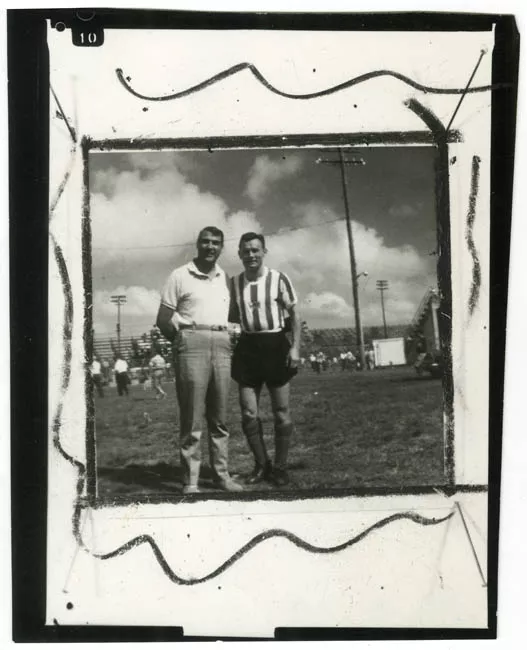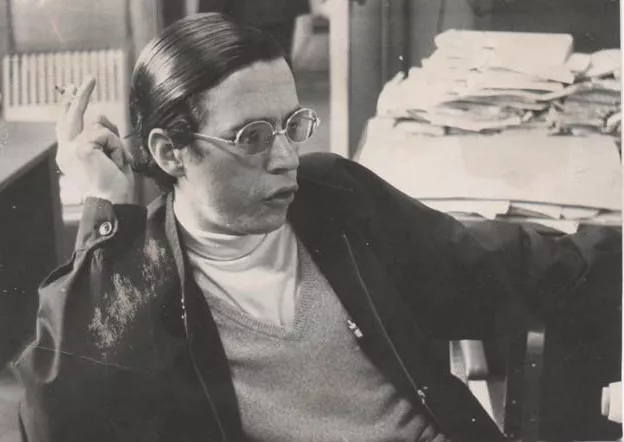 Retrato masculino en que la figura se encuentra de medio lado, levemente girado su cuerpo y cabeza hacia su derecha. Viste chaqueta con diseño geométrico, camisa y corbata, además de anteojos de marcos transparentes y metal. Su cabello es oscuro y lo presenta peinado hacia atrás, tiene bigotes. El fondo es plano, de color gris.