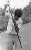 La imagen monocroma, de formato rectangular dispuesta horizontalmente, representa un grupo de personas trabajando la tierra con herramientas. En primer plano un niño con una pala.