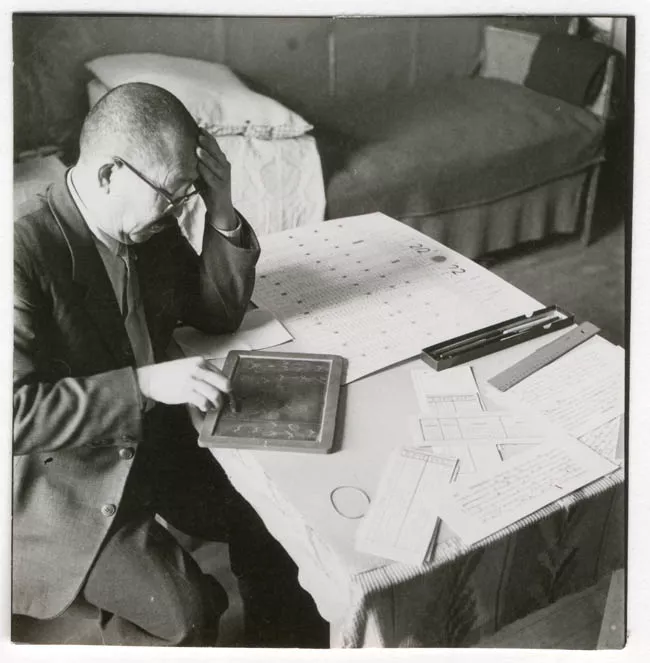 La imagen monocroma, de formato rectangular dispuesta horizontalmente, representa un grupo de mujeres reunidas alrededor de una mesa en una fábrica textil.