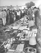 La imagen monocroma, de formato rectangular dispuesta horizontalmente, representa un grupo de personas, hombres y mujeres, trabajando la tierra con palas.