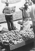 La imagen monocroma, de formato rectangular dispuesta horizontalmente, representa un grupo de personas en un campo de vid.