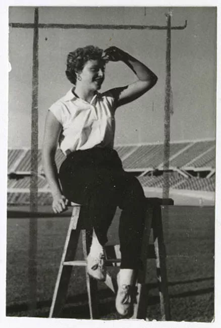 La imagen monocroma, de formato rectangular dispuesta horizontalmente, representa una mujer frente a un puesto de venta de papas.