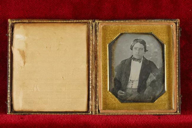 Estuche rectangular de madera, de color café, forrado en cuero y terci...