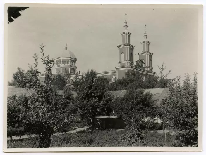 Copia fotográfica en blanco y negro, de formato rectangular y orientación horizontal. La imagen muestra un edificio de dos niveles con muros lisos y techo de tejas, ubicado en una calle con leve pendiente. En el primer nivel, la construcción presenta una serie de arcos de medio punto sostenido por pilares, conformando un pórtico cubierto que se extiende en gran parte de la fachada. Sobre esta estructura, en el segundo nivel, hay una terraza con barandas de balaustres. A cada extremo del edificio, se observan secciones que rematan en la parte superior con un frontón triangular, siendo completamente visible en la imagen el del lado derecho. Esta sección presenta una entrada de arco rebajado y rejas metálicas, flanqueada por dos ventanas con el mismo diseño. En el segundo nivel, hay una puerta con balcón de barandas de hierro. En la vereda, se distingue un poste de sistema eléctrico, y hacia ambos extremos de la imagen, personas caminando. En el fondo, el cielo es de tonalidad clara y uniforme.