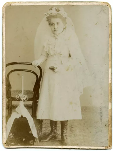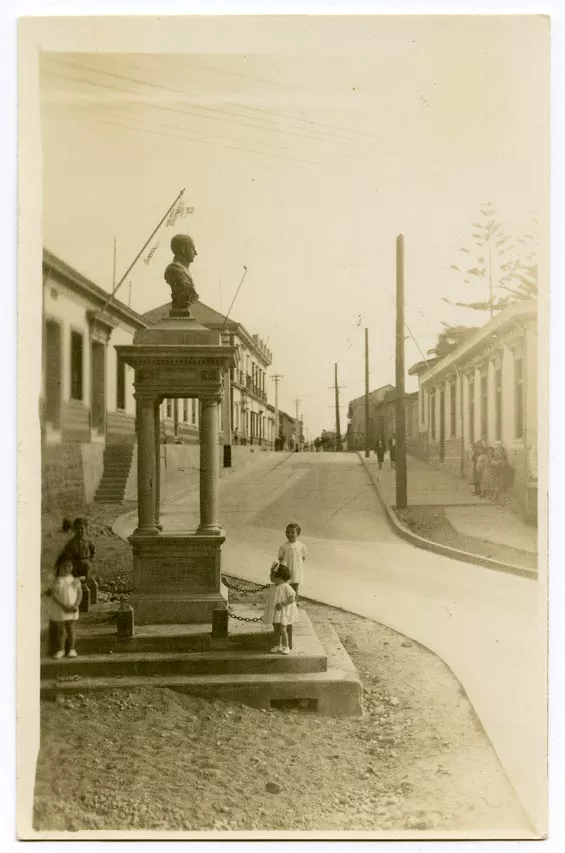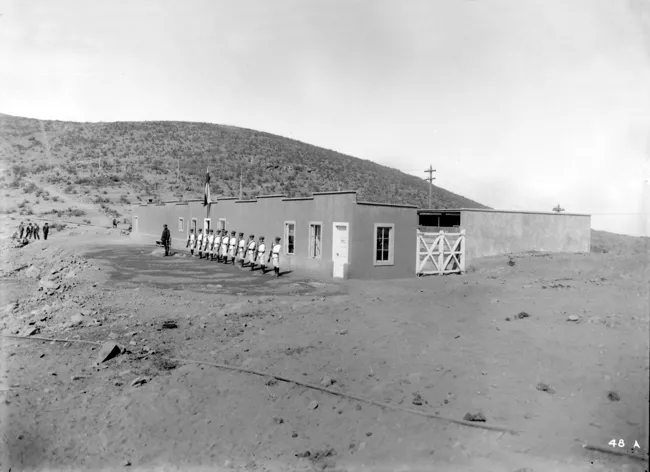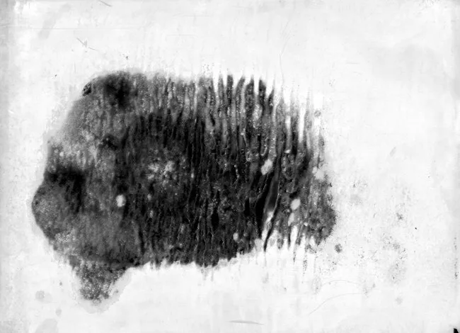 Copia fotográfica en blanco y negro, de formato rectangular y orientación horizontal. En primer plano, en el borde derecho, tres figuras masculinas junto asado a ras de fuego, donde varias piezas de carne están dispuestas sobre estructuras metálicas. El primero, que viste chaqueta acolchada y pantalones claros, sostiene un trozo de alimento en las manos. A su lado, un hombre con traje oscuro y corbata dirige la mirada hacia abajo, mientras que, al fondo, una tercera figura masculina con boina los acompaña, parcialmente visible. La escena transcurre en un entorno natural, con suelo de pasto bajo y árboles dispersos. La fotografía está adherida a una hoja de álbum, y bajo ella se observa una inscripción manuscrita en tinta negra, de carácter identificatorio.