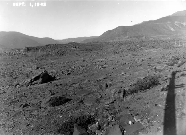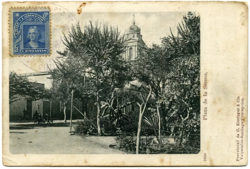 Copia fotográfica en blanco y negro virada a sepia, de formato rectangular y orientación vertical, montada sobre cartón con marco impreso en tinta roja. En primer plano, enmarcado en óvalo, se retrata de medio cuerpo a una figura masculina joven en actitud de tres cuartos, con la mirada dirigida hacia la derecha. Viste abrigo grueso de textura visualmente densa y camisa clara; lleva el cabello ondulado y bigote delgado. La figura está sentada en una silla de respaldo tapizado, con tallas ornamentales visibles. En el margen inferior del soporte, centrado bajo la imagen, se observan textos impresos junto a un escudo. El soporte presenta leves señales de desgaste en las esquinas inferiores.