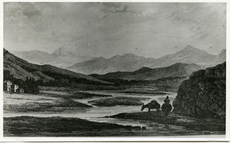 Copia fotográfica en blanco y negro, de formato rectangular y orientación horizontal, adherida a cartulina texturizada de color claro. En primer plano, grupo de mujeres adultas organizadas en hileras frente a un edificio de fachada lisa y clara, con ventanas rectangulares de marcos oscuros. La mayoría de las figuras visten uniformes claros; varias de ellas llevan cofias que presentan un símbolo de cruz en tonalidad oscura que contrasta con el fondo blanco. Algunas figuras visten trajes oscuros. En la primera fila están sentadas, y en las filas posteriores permanecen de pie, todas mirando al frente. La fotografía está recortada con borde dentado y adherida al soporte. En la cartulina se observan inscripciones manuscritas en tinta oscura, ubicadas en el borde inferior y en los bordes superior izquierdo y derecho.