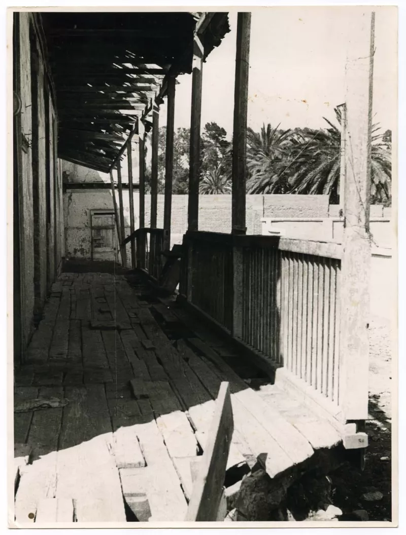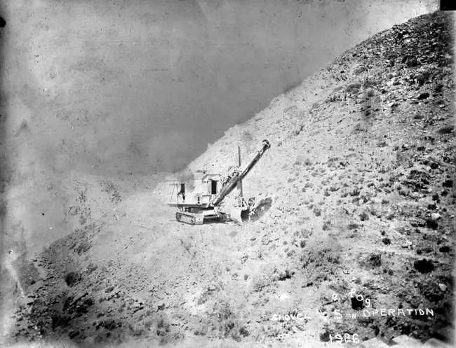 Copia fotográfica en blanco y negro, de formato rectangular y orientación horizontal. En primer plano, agrupación numerosa de figuras masculinas adultas en actitud de desplazamiento o conversación. Algunas visten uniforme militar con gorra, mientras que otras llevan trajes de chaqueta y pantalones, con sombrero. En segundo plano, se observa una aeronave de gran envergadura, con dos motores con hélices montados sobre el ala elevada. En la cola se distingue un número y una estrella blanca inscrita en un fondo oscuro. La escena ocurre en un espacio exterior despejado, con suelo de tierra y un fondo montañoso ligeramente desenfocado.