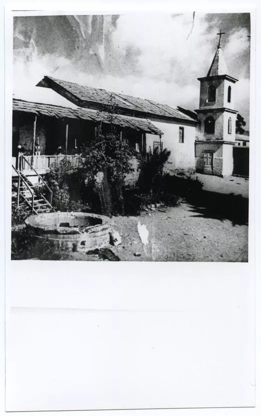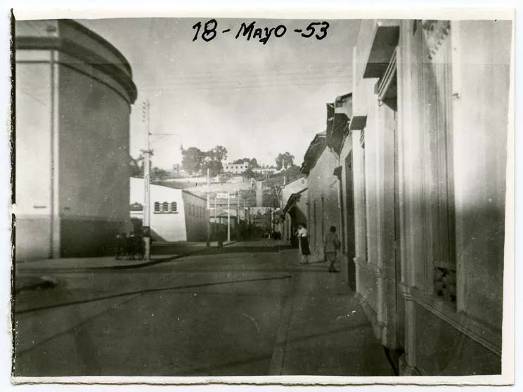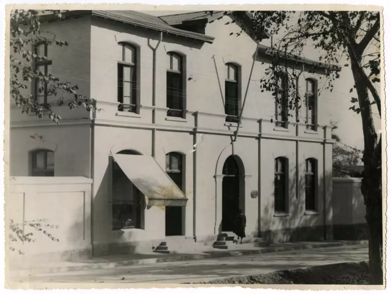 Copia fotográfica en blanco y negro, de formato rectangular y orientación horizontal. En primer plano, una multitud de figuras masculinas, femeninas e infantiles se agrupa en distintos niveles de una escalinata pública. Al centro, un grupo de jóvenes con vestidos claros y bandas cruzadas con letras visibles posa con expresión seria o sonriente, acompañadas de niñas pequeñas. Algunas figuras alzan el puño derecho. Sobre ellas, un cartel manuscrito es sostenido en alto, mientras que al fondo se despliega un gran lienzo con letras visibles junto al pasamanos de la escalera. La escena transcurre frente a un edificio de fachada oscura, con más personas visibles en los peldaños y ventanas. La imagen presenta desgaste leve y zonas con pérdida de nitidez.