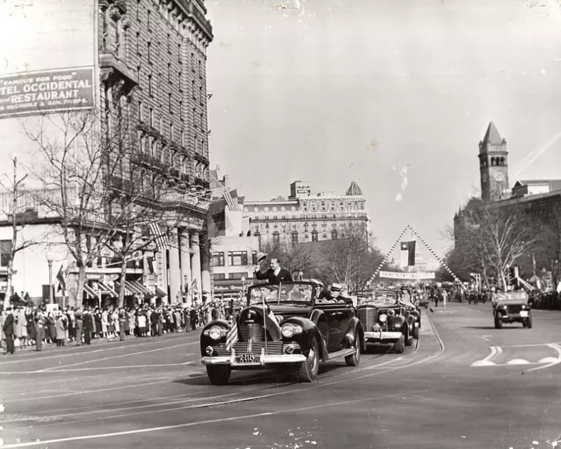 Presidente González Videla saluda desde su vehículo en su gira a Estados Unidos