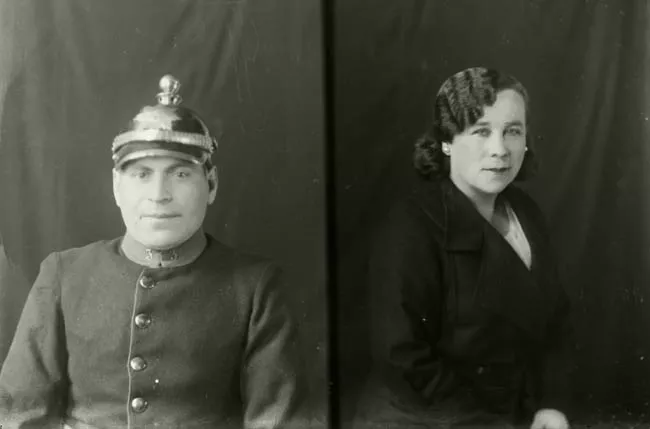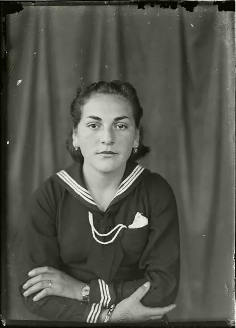 Imagen digitalizada a partir de negativo en placa de vidrio de formato rectangular y disposición vertical. Composición en base a cuerpo completo de figura infantil femenina de pie, en posición tres cuartos hacia la izquierda. Tiene las manos a la altura del torso y en ellas sostiene un ramo de lirios blancos de tela atados con un lazo blanco con una inscripción. Además, en su mano izquierda, un rosario y un misal, ambos blancos. La figura se encuentra al centro de la imagen, en primer plano. Tiene el cabello oscuro y peinado hacia atrás, cubierto por un cintillo de flores blancas y tras este, un velo con una parte frontal que se levanta por sobre el cintillo y una parte trasera que cae por la espalda. Alrededor del cuello, una cadena metálica con un pendiente en forma de cruz, también metálico. Lleva un vestido blanco largo hasta el suelo, de mangas largas tipo globo, con cuello bebé y vuelos en el canesú y el ruedo de la falda. De su muñeca izquierda cuelga una bolsa blanca con vuelos en los bordes. En sus manos, guantes blancos. En los pies, medias y sandalias blancas. La figura se encuentra sobre una alfombra de patrón geométrico que a su vez está extendida sobre un suelo de madera. En el fondo, un telón liso.