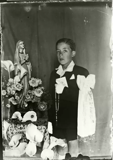 Imagen digitalizada a partir de negativo en placa de vidrio de formato rectangular y disposición vertical. Composición en base a figura femenina infantil arrodillada, en posición tres cuartos hacia la izquierda con rostro en igual dirección, ubicada en el centro de la imagen, en primer plano. Tiene el cabello de color oscuro, con flequillos. Lleva corona de flores con velo, guantes y vestido blanco con manga completa y de largo hasta los pies. Tiene las manos juntas a la altura del pecho, en actitud de oración. Al lado izquierdo de la figura se aprecia un altar de mantel blanco con bolillo, y en la parte superior una figura religiosa y flores. En la esquina del altar se encuentra una cinta blanca que tiene escrito "María Isabel Cárdenas G.", a su lado otra cinta blanca que dice "RECUERDO DE MI PRIMERA COMUNION" Seguida por otra frase en la que se alcanza a distinguir las palabras "Castro" y "de Diciembre de 1954". La niña observa la figura religiosa. Ella se encuentra sobre una alfombra con diseño. Al fondo un telón en tonos grises.