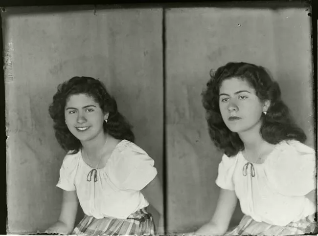 Figura infantil en posición tres cuartos hacia la izquierda, casi de perfil, con el rostro y mirada girados hacia la cámara. Tiene su brazo derecho posado sobre el hombro izquierdo de la primera figura. Viste una chaqueta de tono oscuro sobre una camisa blanca. La imagen carece de nitidez en el rostro de la figura.