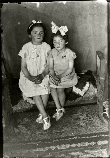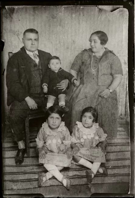 Imagen digitalizada a partir de negativo en placa de vidrio de formato rectangular y disposición horizontal. Composición en base a cuerpo completo de cinco figuras infantiles masculinas, al centro de la imagen, y en primer plano. Las figuras se encuentran sedentes sobre una manta con motivo escocés y flecos en los bordes. Se encuentran en posición tres cuartos hacia la izquierda con los rostros hacia la cámara, dispuestos en una hilera, uno tras otro, en orden ascendiente de altura de izquierda a derecha. De izquierda a derecha: