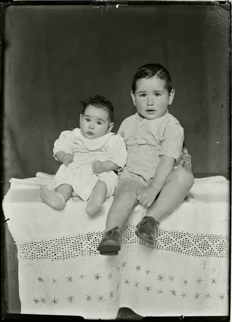 Imagen digitalizada a partir de negativo en placa de vidrio de formato rectangular y disposición horizontal. Composición en base a cuerpo casi completo de dos figuras masculinas infantiles sedentes sobre superficie en altura, cubierta por tela en tono gris con diseño. Se encuentran al centro de la imagen en primer plano y ambos miran hacia la cámara.