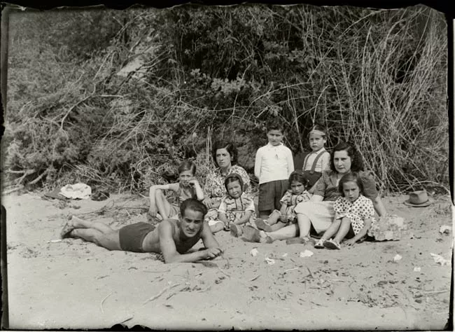 Imagen digitalizada a partir de negativo en placa de vidrio de formato rectangular y disposición horizontal. Composición en base a cuerpo completo de once figuras masculinas, casi todas en posición de frente hacia la cámara, dispuestos para una fotografía. Las figuras están dispuestas en dos filas. La primera está compuesta por cinco figuras en cuclillas y la segunda por seis figuras de pie. Diez de las once figuras visten camisetas abotonadas al centro con tres botones. Las camisetas son de manga corta y tienen franjas verticales que intercalan blanco y negro. Visten shorts negros y calcetines grises hasta las rodillas. En el borde superior de los calcetines, una franja horizontal blanca con una línea negra al centro. En los pies, zapatos oscuros con cordones blancos.