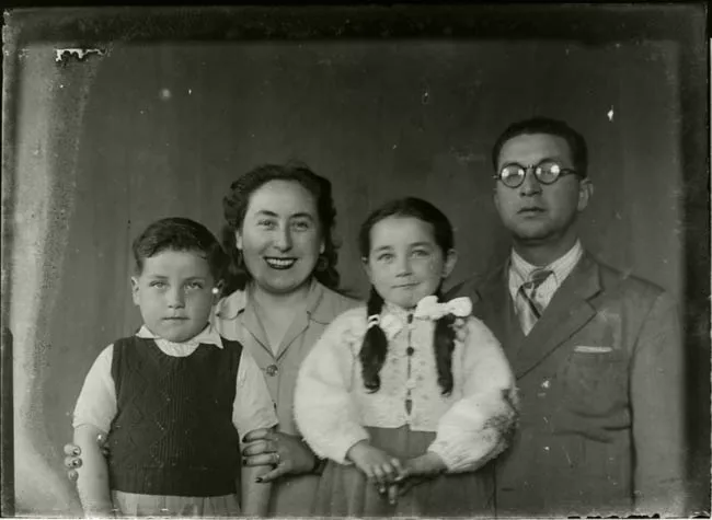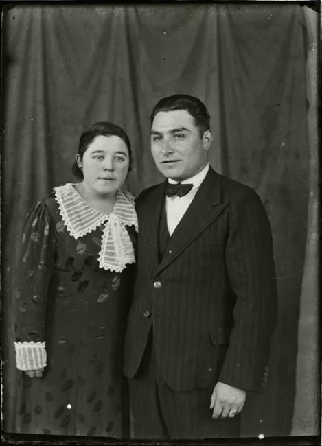 Imagen digitalizada a partir de negativo en placa de vidrio de formato rectangular y disposición vertical. Composición en base a figura femenina sedente, ubicada en primer plano al centro de la imagen. La figura se encuentra en posición tres cuartos hacia la derecha, con rostro y mirada en leve tres cuartos hacia la izquierda. Lleva un vestido con escote fuera de los hombros, con diseño en tela transparente en la parte superior. Ajustado en la cintura y de ruedo amplio, largo, en color blanco liso. Tiene puestos unos guante hechos con la misma tela del cuello. La figura tiene el pelo ondulado, en un peinado hasta los hombros. En su cabeza se observa una corona hecha de pequeñas perlas. Alrededor de su cuello, un colgante redondo con cadena. En su mano izquierda, lleva un anillo en el dedo medio.