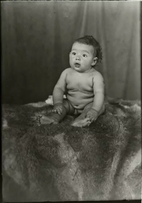 Imagen digitalizada a partir de negativo en placa de vidrio de formato rectangular y disposición vertical. Composición en base a figura femenina de pie, ubicada en primer plano al centro de la imagen. La figura se encuentra en posición de leve tres cuartos hacia la derecha, con rostro y mirada hacia la cámara. Lleva un vestido con escote fuera de los hombros, con diseño en tela transparente en la parte superior. Ajustado en la cintura y de ruedo amplio, largo hasta los tobillos, en color blanco liso. Sobre los hombros lleva una capa blanca con los bordes hechos de piel. Tiene puestos unos guante hechos con la misma tela del cuello. La figura tiene el pelo ondulado, en un peinado hasta los hombros. En su cabeza se observa una corona hecha de pequeñas perlas. Alrededor de su cuello, un colgante redondo con cadena. Tiene ambas manos apoyadas en su cintura. Colgando de su brazo derecho, una capa en tonos grises y bordes con piel de largo hasta el suelo. En su mano izquierda, lleva un anillo en el dedo medio.