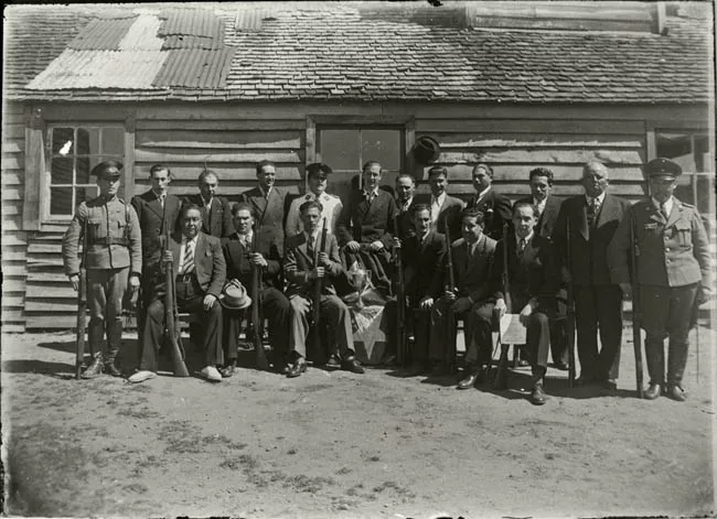 Imagen digitalizada a partir de negativo en placa de vidrio de formato rectangular y disposición horizontal. Composición en base a diez figuras adultas en torno a objeto central cubierto de flores, con tres velas por los lados y que encima lleva una cruz junto a una figura religiosa.