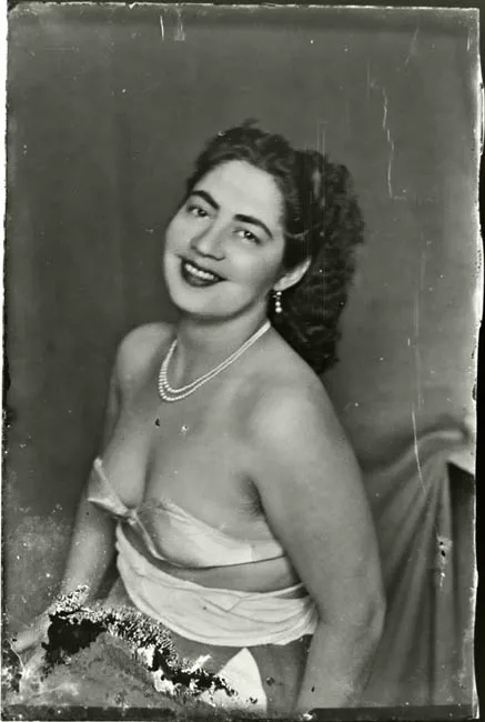 Imagen digitalizada a partir de negativo en placa de vidrio de formato rectangular y disposición vertical. Composición en base a medio cuerpo de figura femenina sedente. Está ubicada al centro de la imagen en primer plano, en posición de frente. Cabello oscuro con algunas canas, algo despeinado y tomado hacia atrás. Viste blusa en tono oscuro con diseño de franjas verticales y horizontales en tono mas claro, de manga larga, cuello camisero cerrado y abrochada por el frente. Hacia abajo usa falda en tono oscuro y liso. Lleva pendientes que cuelgan.