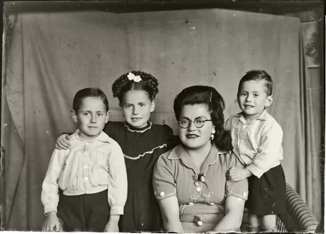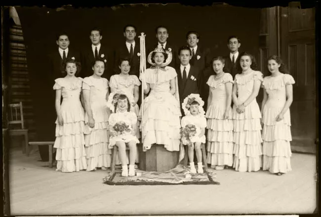 Fotografía 1: Composición en base a torso de figura femenina con los hombros en posición tres cuartos hacia la derecha y el rostro hacia la izquierda y la mirada hacia la cámara, al centro de la imagen y en primer plano. La figura tiene el cabello oscuro, rizado, con un pequeño flequillo y largo hasta los hombros. Lleva pendientes en forma de argollas metálicas. Ocupa una blusa blanca con mangas cortas tipo globo y cuello redondo, amplio. En el borde del cuello, una cinta de tono oscuro, atada en un lazo. A lo largo del canesú, bordados de motivo floral. En el fondo, un telón liso.