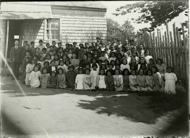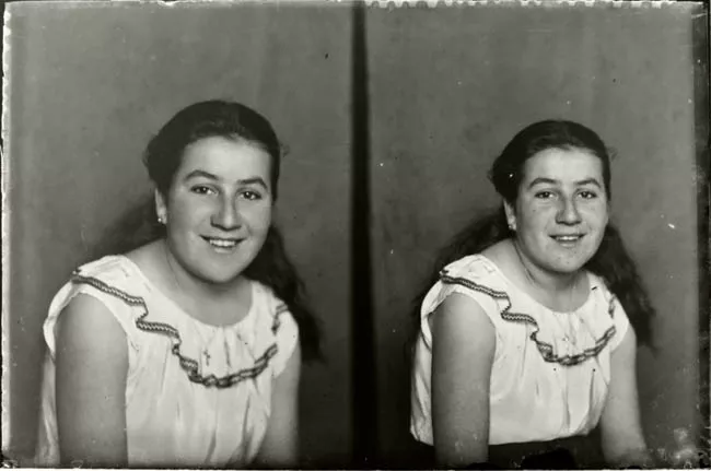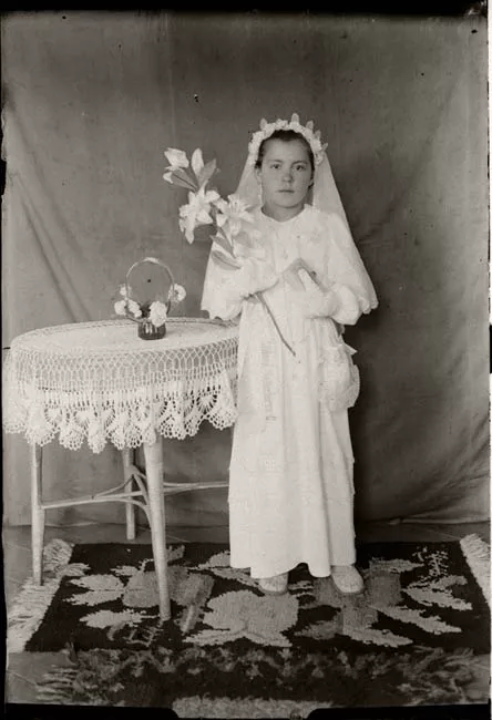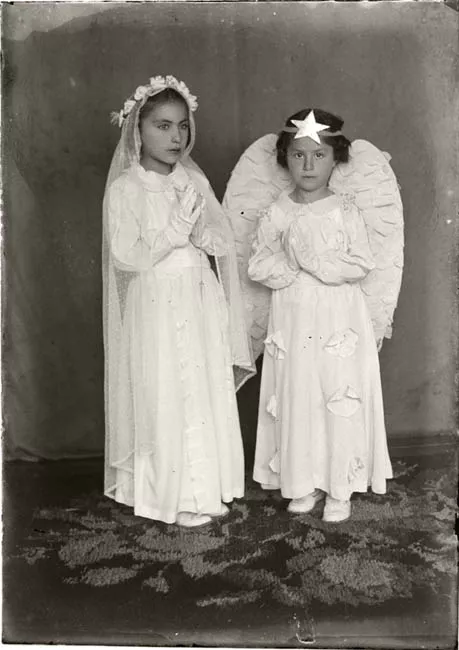 Imagen digitalizada a partir de negativo en placa de vidrio de formato rectangular y disposición vertical. Composición en base a cuerpo completo de dos figuras infantiles sedentes, una junto a la otra, al centro de la imagen y en primer plano. Ambas figuras tienen el cabello oscuro, ondulado, partido al centro y tomado a los lados con lazos blancos. Ambas visten iguales, vestidos blancos con mangas cortas tipo globo, cuello bebé y bordados en el canesú. En las piernas, soquetes blancos y en los pies, zapatos blancos con detalles oscuros en las puntas. La figura de la izquierda ocupa pequeños pendientes esféricos. La figura de la derecha tiene el rostro ligeramente más ancho que la figura anterior.