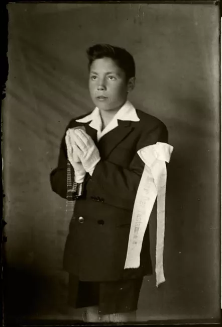 Figura masculina infantil en posición sedente y frente a la cámara, con mirada en tres cuartos hacia la izquierda. Viste una chaqueta en tono beige, con cinco botones y cuello de camisa. En el puño de su brazo derecho se observa otro botón. Usa pantalones con líneas verticales. Tiene el cabello oscuro, corto, y ojos claros. Sonríe.