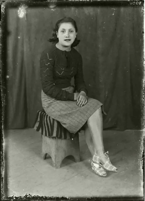 Fotografía 1: Composición de formato vertical en base a busto de figura femenina en posición tres cuartos hacia la izquierda, con rostro y mirada hacia la cámara. Cabello oscuro, liso en la parte superior con partidura al centro y que está tomado a cada lado de su cabeza, en peinado ondulado que cae justo por sobre los hombros. Viste prenda en tono gris de cuello cerrado. Encima, usa abrigo de tela gruesa en tono gris claro con diseño de pequeños puntos sin orden aparente que más asemejan a una textura, que va cruzado por el frente. La figura usa labial en tono oscuro. Sonríe mostrando los dientes. En el fondo un telón liso.
