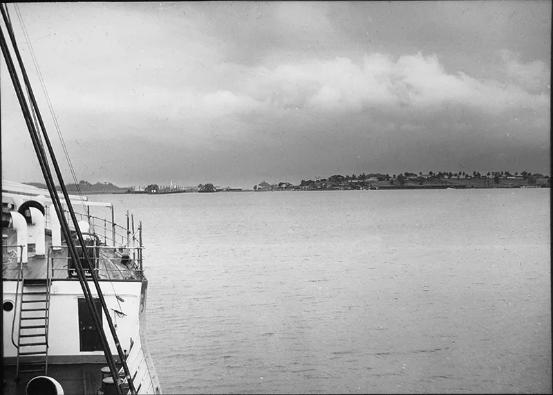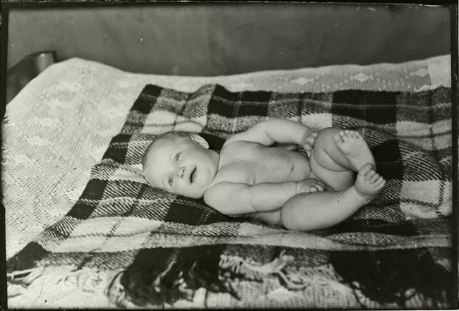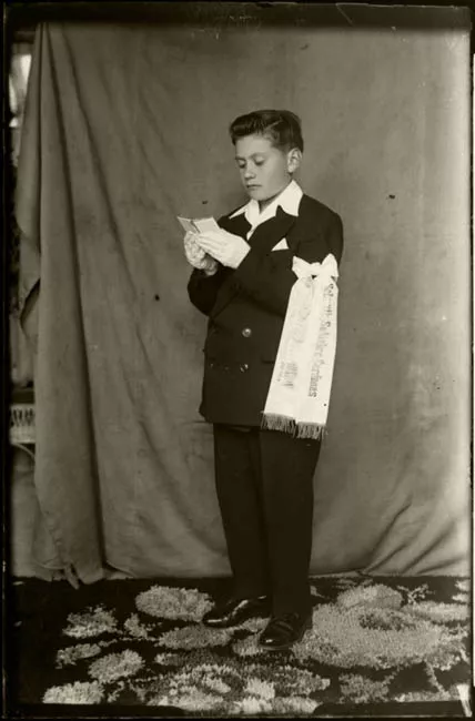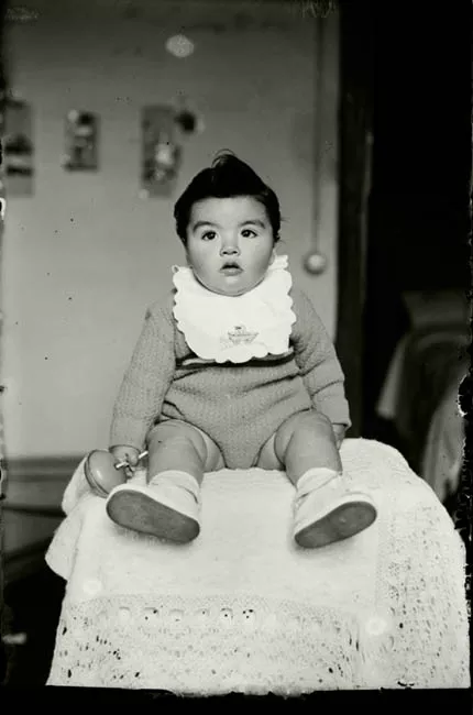 Imagen digitalizada a partir de negativo en placa de vidrio de formato rectangular y disposición horizontal. Composición en base a cuerpo completo de doce figuras de pie sobre la hierba, dispuestas en dos filas para tomarse una fotografía. Se encuentran ubicadas al centro de la imagen, en primer plano, en un espacio exterior rodeado de vegetación, bajo una estructura techada.