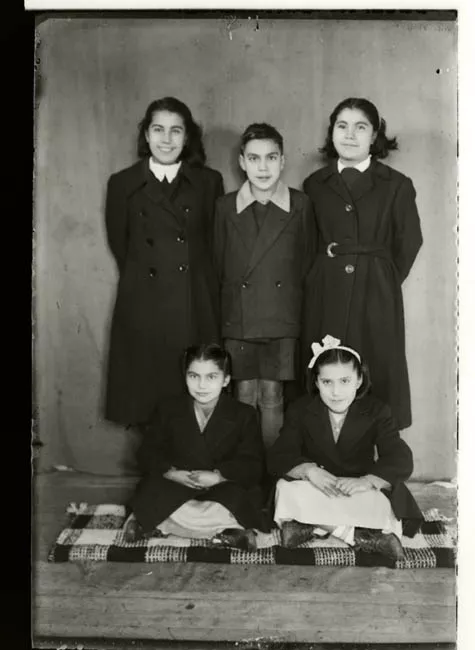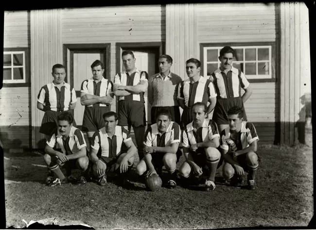 Imagen digitalizada a partir de negativo en placa de vidrio de formato rectangular y disposición vertical. Composición en base a cuerpo entero de figura femenina de pie, en posición tres cuartos hacia la izquierda con rostro girado hacia el frente y mirada hacia la cámara. Cabello oscuro, rizado, con partidura al medio y peinado en una melena sobre los hombros. Viste blusa en tono claro, blazer en tono oscuro abrochado por el frente mediante un botón y con pañuelo en el bolsillo superior y falda en tono similar a la chaqueta que cae lisas por debajo de la rodilla. En los pies usa zapatos en tono oscuro con tacón. La figura tiene su mano derecha apoyada sobre la cubierta de una pequeña mesa redonda ubicada al lado izquierdo de la imagen. Sonríe mostrando los dientes. En el fondo un telón con pliegues.