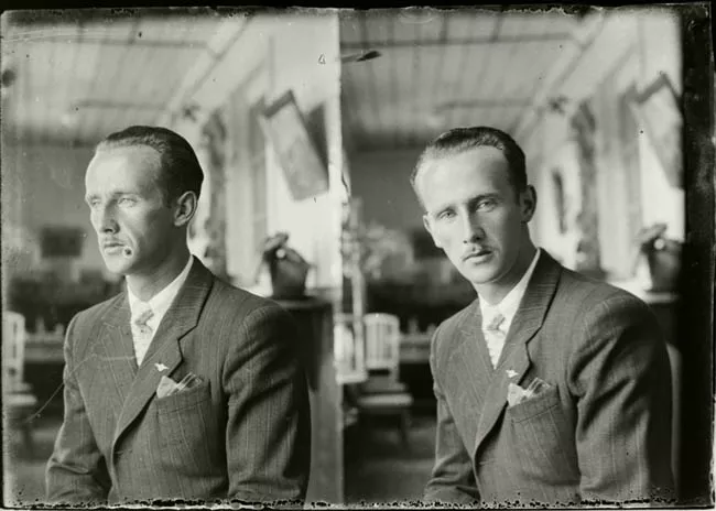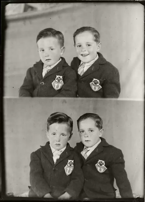 Imagen digitalizada a partir de negativo en placa de vidrio de formato rectangular y disposición horizontal. La imagen se compone por diez figuras masculinas en disposición frontal y mirada fija al espectador posando para un retrato grupal. Las figuras se organizan en dos filas dispuestas horizontalmente, la primera fila se componen por tres hombres sedentes sobre sillas de patas rectas y la segunda fila, en la parte posterior, se compone por siete hombres de pie. Los hombres visten trajes de tonalidad media y oscura con camisa claras y corbatas anudadas. En segundo plano un telón en medio tono de fondo.