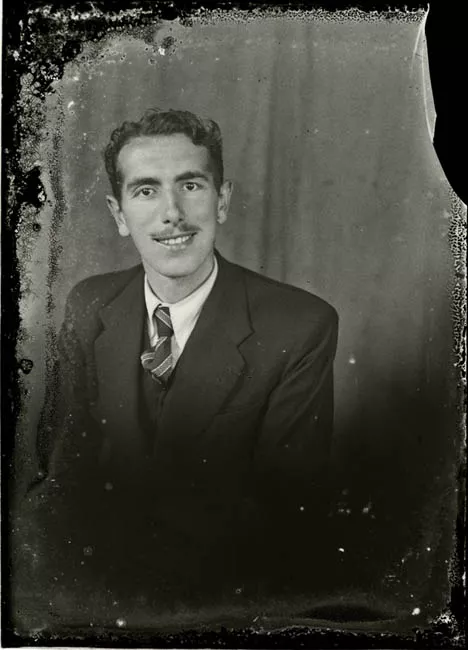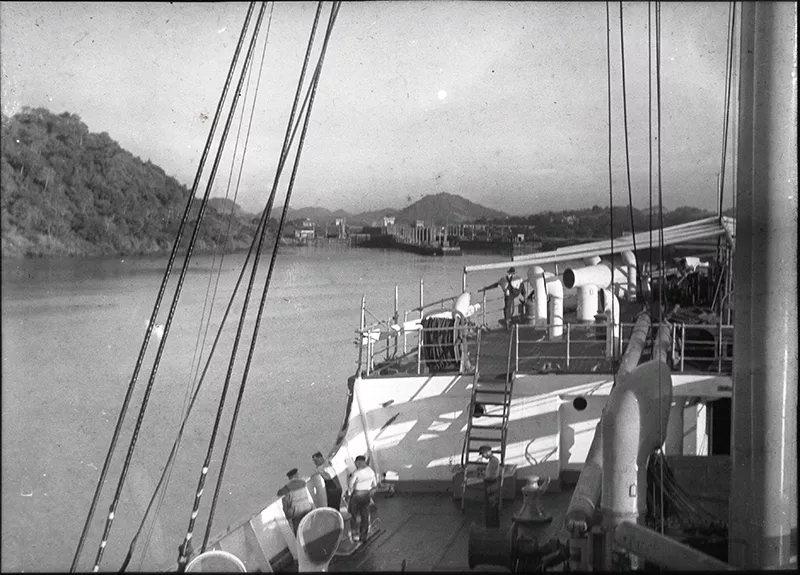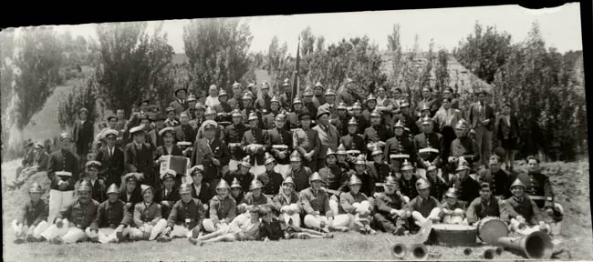Imagen digitalizada a partir de negativo en placa de vidrio de formato rectangular y disposición horizontal. Composición en base a un paisaje urbano. La imagen corresponde a una visión panorámica que se compone en base a una línea de ferrocarril. En primer plano y en el sector izquierdo de la imagen se observa un caballo de pelaje clara atado a una carroza y detrás otra carroza con dos persona en el interior. En segundo plano un vagón de tren oscuro y dos personas al frente, al costado izquierdo una construcción regular de tejado inclinado y gran cantidad de personas fuera y en los alrededores. En el sector derecho una construcción regular clara. Al fondo se observan árboles. En la parte superior de la imagen cielo en tonos claros con nubes.