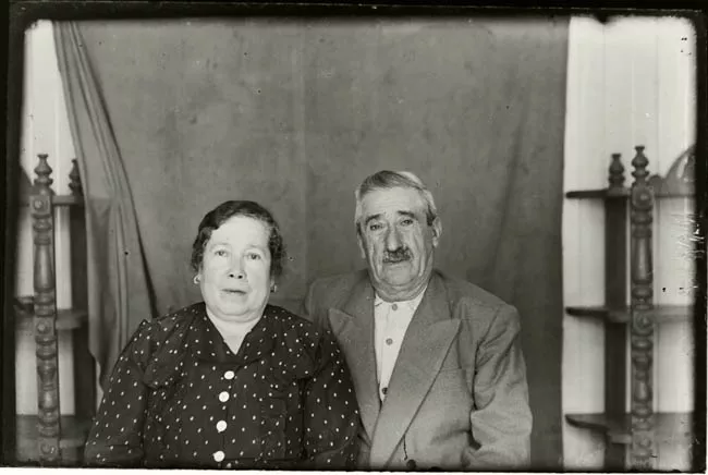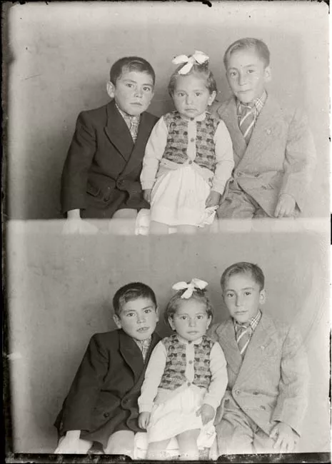 Imagen digitalizada a partir de negativo en placa de vidrio de formato rectangular y disposición vertical. La imagen de estudio está compuesta por una figura femenina de cuerpo entero, dispuestos en encuadre central y de pie. El retrato de niña en disposición frontal de pie sobre un soporte cubierto por un manto velludo en tonalidades claras y oscuras. Posee cabello oscuro, corto y rizado, mirada fija al espectador. Lleva un vestido claro de mangas cortas y abombadas y calza zapatos claros sobre medias claras. Ambos brazos caen a los costados. En segundo plano fondo telón de tonalidad media con dobleces.