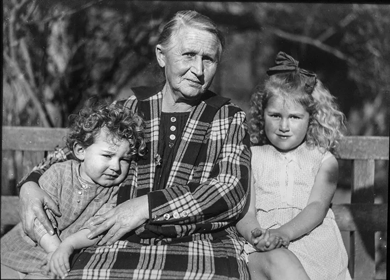 Imagen digitalizada a partir de negativo en placa de vidrio de formato rectangular y disposición vertical. La imagen de estudio está compuesta por veinticuatro figuras posando para un retrato grupal, en disposición frontal y en encuadre central. Se disponen de cuerpo entero, encuadre central y en disposición frontal, llenando toda la imagen para presentar las figuras. Las figuras se encuentran organizados por filas dispuestas horizontalmente de menor a mayor altura. Veinte de la figuras son infantiles, femeninas y masculinas, dieciocho sedentes sobre gradas de madera y dos de pie a los costados de la parte superior. Viste blusas claras de cuellos abiertos, las niñas con faldas y los niños pantalones ambos en tonalidad media. En el fondo, en la parte superior se observan cuatro figuras adultas, dos masculinos y dos femeninos vestidos con trajes oscuros. La escena se emplaza en exterior, en segundo plano se observa una pared de madera con tablas horizontales, se observan dos ventanas rectangulares, en la parte superior izquierda se observa la inscripción SECUNDARIO