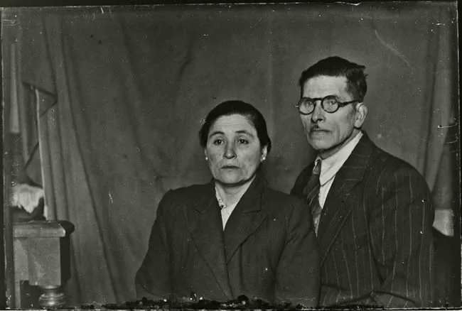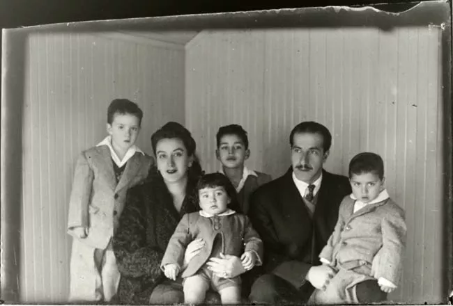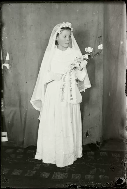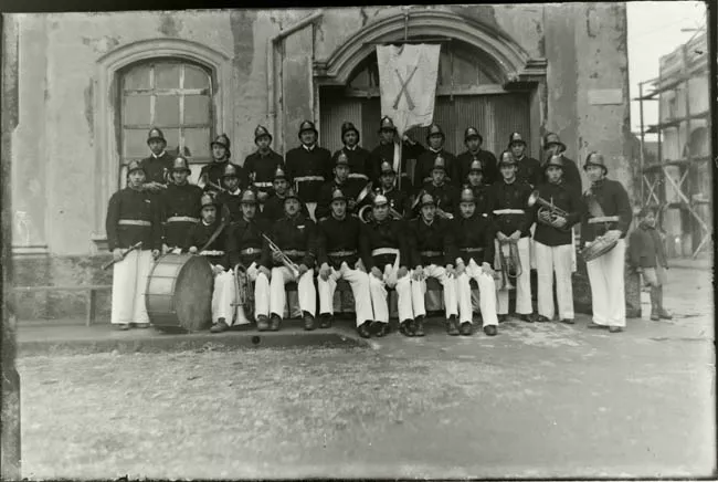 Imagen digitalizada a partir de negativo en placa de vidrio de formato rectangular y disposición horizontal. La imagen de estudio está compuesta por doce figuras masculinas posando para un retrato grupal, en disposición frontal y en encuadre central. Se disponen de cuerpo entero, dispuestos en encuadre central. En primer plano cinco figuras sedentes, cuatro son niños y en la parte central un hombre adulto. En segundo plano siete figuras masculinas de pie y en disposición frontal, seis figuras infantiles y figura central adulta. Las doce figuras masculinas se encuentran ataviadas con hábito de religioso franciscano oscuros con un cordón claro a la cintura con nudos. La escena se emplaza en exterior, las figuras se emplazan sobre una alfombra oscura con diseños florales claros. Al fondo se observan construcciones regulares en tonalidad media, al costado izquierdo una construcción dispuesta transversalmente.