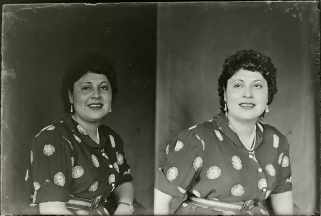Imagen digitalizada a partir de negativo en placa de vidrio de formato rectangular y disposición vertical. La imagen de estudio está compuesta por una figura femenina de medio cuerpo, en encuadre central. La mujer se encuentra sedente, en disposición central de medio cuerpo en disposición frontal y en primer plano. Posee cabello oscuro, corto y peinado a los costados, dejando ver sus dos orejas con pequeños aretes. Mirada fija al espectador. Lleva un vestido oscuro de mangas largas y un cinturón oscuro, posee un cuello, con tres líneas claras en los bordes, de marinero que se extiende cubriendo la espalda y con una corbata en la parte frontal; posee un pañuelo blanco en su bolsillo superior y con una cuerda clara. Sus brazos cruzados sobre el busto. En segundo plano fondo telón de tonalidad media con dobleces.