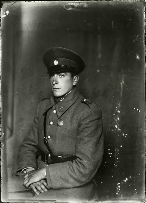 Inmediatamente a su lado y en el sector derecho de la imagen se observa un hombre en primer plano, retratado a medio cuerpo en disposición frontal, lleva cabello corto oscuro peinado hacia atrás y mirada fija al espectador. Se encuentra ataviado con un traje claro de solapa ancha, camisa cuello ingles clara y corbata anudada con patrón de líneas diagonales en tonos claros y oscuros. En segundo plano telón en medio tono de fondo con dobleces.