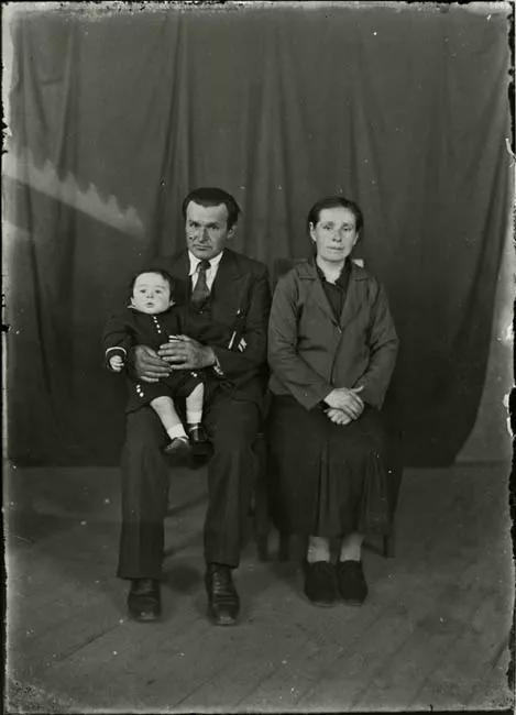 Imagen digitalizada a partir de negativo en placa de vidrio de formato rectangular y disposición vertical. La imagen está compuesta por una figura infantil masculina de cuerpo entero en primer plano dispuesta en encuadre central. Retrato de niño de pie en disposición frontal, cabello oscuro y corto peinado hacia atrás, mirada fija al espectador y boca entre abierta. Viste un traje oscuro compuesto por una camisa de mangas cortas y pantalones cortos con un cinturón. Calza zapatos oscuros y medias claras. Ambos brazos unidos frente al pecho sosteniendo un objeto entre las manos.