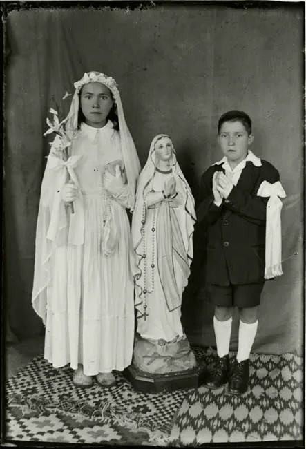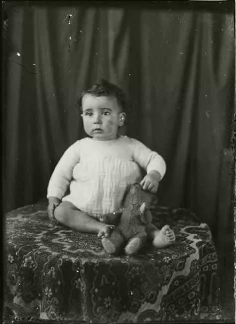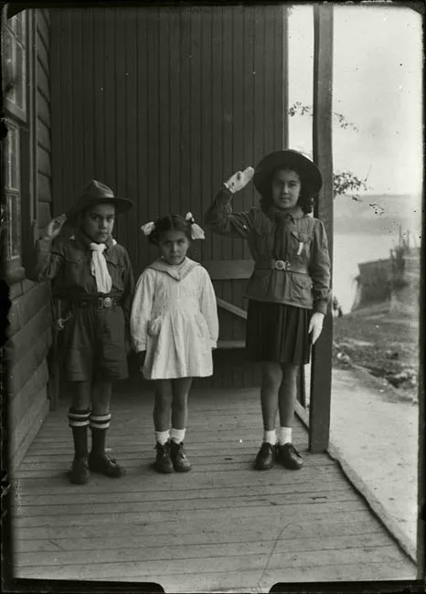 Imagen digitalizada a partir de negativo en placa de vidrio de formato rectangular y disposición horizontal. Composición en base a veintinueve figuras masculinas, de cuerpo completo, posando para un retrato grupal. En primer plano se observan seis figuras sedentes, con piernas abiertas y manos sobre las rodillas. En la segunda fila hacia atrás se encuentran once figuras de pie con los brazos a los costados y una bandera en mástil en el centro. En la tercera fila hacia atrás se observan doce figuras de pie sobre un soporte en mayor altura a las otras filas. Los veintinueve hombres vestidos de trajes formales, de chaqueta oscura y pantalones claros, calza zapatos oscuros y casco oscuro sobre la cabeza.