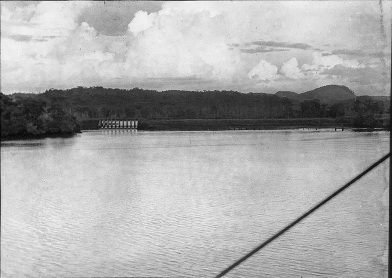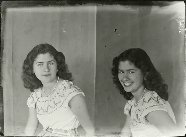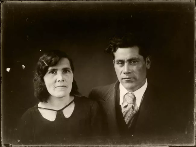 Imagen digitalizada a partir de negativo en placa de vidrio de formato rectangular y disposición vertical. La imagen está compuesta por dos figuras masculinas de cuerpo entero, dispuestas en encuadre central emplazados en exterior sobre un muro de tablas verticales irregulares. De izquierda a derecha, figura masculina en primer plano, retratada de cuerpo entero en disposición frontal. Lleva sombrero flexible claro de cinta oscura, viste un traje claro de chaqueta abierta, chaleco abotonado, camisa clara y corbata anudada oscura. Calza zapatos oscuros, su brazo derecho cae dejando su mano dentro del bolsillo del pantalón, el brazo izquierdo cae al costado sosteniendo un cigarro entre sus dedos.