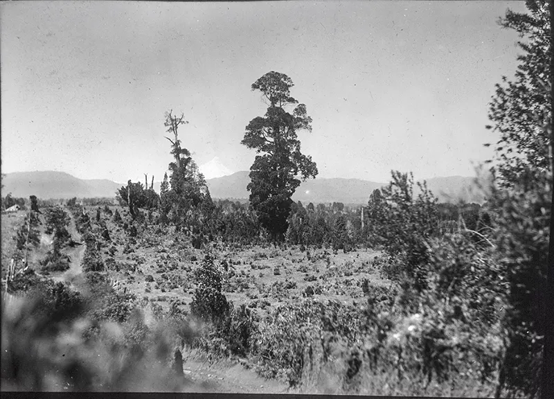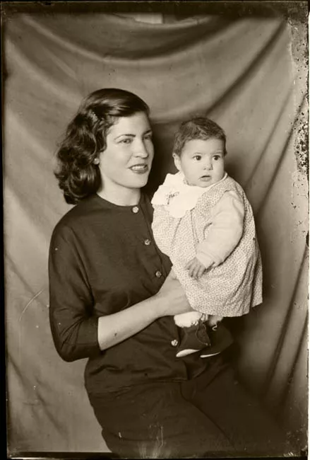 Imagen digitalizada a partir de negativo en placa de vidrio de formato rectangular y disposición vertical. Composición en base a figura femenina de pie, ubicada en primer plano al centro de la imagen. La figura se encuentra en posición de leve tres cuartos hacia la derecha, con rostro y mirada en igual dirección. Cabello ondulado, oscuro, en una melena hasta los hombros. En su cabeza se observa una corona hecha de pequeñas perlas. Lleva un vestido con escote fuera de los hombros, con diseño en tela transparente en la parte superior. Es ajustado en la cintura y de ruedo con pliegues, largo hasta los tobillos, en color blanco liso. Tiene puestos unos guante hechos con la misma tela del cuello y zapatos de color blanco. Alrededor de su cuello, un colgante redondo con cadena. Usa pendientes de perla. Desde su hombro derecho cuelga diagonal una banda hasta la cintura de color blanca. La figura sonríe.