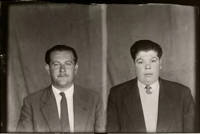 Imagen digitalizada a partir de negativo en placa de vidrio de formato rectangular y disposición vertical. Composición en base a cuerpo entero de dos figuras ubicadas al centro de la imagen en primer plano.