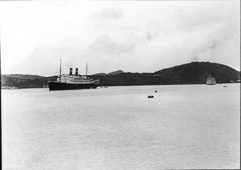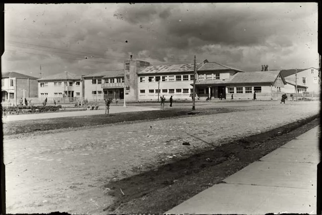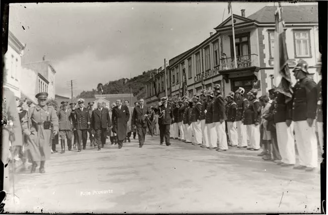 Imagen digitalizada a partir de negativo en placa de vidrio de formato rectangular y disposición vertical. Composición en base cuerpo entero de figura infantil masculina de pie, en posición de frente, con rostro y mirada en igual dirección. Está ubicado en el centro de la imagen en primer plano. Cabello oscuro, corto y rizado. Lleva una prenda de color claro, manga larga, cruzada con cuatro botones. El cuello es de color oscuro y tiene sendos dibujos de estrellas y lineas en color claro a cada lado. Los puños también son oscuros con líneas claras. Lleva además un pantalón corto en tono liso y oscuro que está unido a la parte superior mediante botones. Usa sandalias y calcetines blancos. La figura se encuentra sobre un piso de madera. Atrás, un mueble con mantel tejido y variados objetos sobre él. En el mismo plano, la mano y el pie de una figura adulta en el lado izquierdo de la imagen. En el fondo una pared de madera.