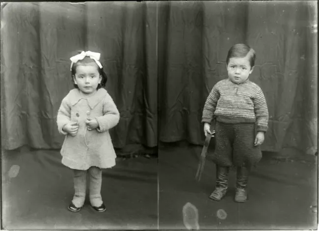 Imagen digitalizada a partir de negativo en placa de vidrio de formato rectangular y disposición vertical. Composición en base cuerpo entero de figura infantil masculina de pie, en posición de frente, con rostro y mirada en igual dirección. Está ubicado en el centro de la imagen en primer plano. Cabello oscuro, corto. Lleva una camisa manga larga, con cuatro botones a la vista, dos bolsillos superiores, de color claro. Lleva además un pantalón corto tono oscuro que está unido a la parte superior mediante botones. Usa zapatos oscuros y calcetines en tono gris.