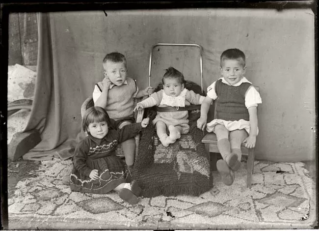 Imagen digitalizada a partir de negativo en placa de vidrio de formato rectangular y disposición vertical. Composición en base a dos figuras infantiles, masculina y femenina en primer plano, de cuerpo entero, al centro de la imagen. Al lado izquierdo, una niña sentada en un sillón de mimbre de pequeño tamaño. Se ubica frente a la cámara con la cabeza de medio perfil. Cabello oscuro melena corta, con cinta blanca al lado derecho de su cabeza. Lleva un vestido hasta la rodilla, collar de perlas y sandalias de color blanco.