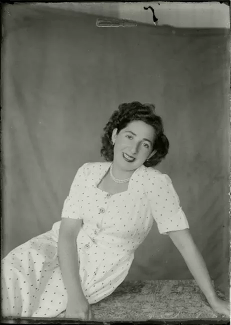Imagen digitalizada a partir de negativo en placa de vidrio de formato rectangular y disposición vertical. Composición en base a figura femenina de pie, en posición tres cuartos hacia la izquierda, y con rostro de frente. Se encuentra ubicada al lado derecho de la imagen, sobre una alfombra con diseño. Lleva el cabello de color oscuro, en un peinado sobre los hombros y con partidura hacia el lado izquierdo de su cabeza. Lleva puesto un vestido hasta más abajo de la rodilla, con manga larga, de color oscuro y cuello V, anudado en el centro estilo marinero, medias de color claro y zapatos oscuros con taco. En muñeca izquierda se observa un reloj pulsera. Su mano izquierda sostiene una cartera. Al lado izquierdo de la imagen se aprecia una mesa lateral con dos niveles. En el nivel inferior se observa un macetero en color oscuro con helecho. En el nivel superior un mantel blanco con bolillo, y sobre él un macetero en color claro con helecho.En el fondo, un telón plisado.