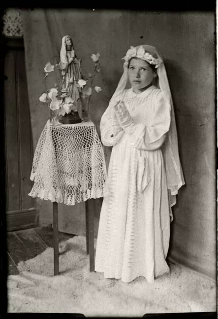 Fotografía 2: Composición de formato vertical en base a medio cuerpo de figura femenina sedente, en posición tres cuartos hacia la derecha con rostro y mirada hacia la cámara. Esta ubicada al centro de la imagen en primer plano. Cabello oscuro, levantado en la parte frontal que cae suelto hasta los hombros. Por el lado derecho de su cabeza lleva una flor blanca. Viste prenda en manga corta y cuello cerrado en tonos claros, con sutiles líneas horizontales. Alrededor de su cuello usa dos vueltas de un collar de perlas. Tiene los labios pintados. En el fondo un telón liso.