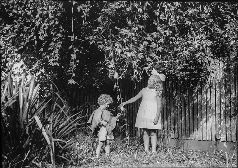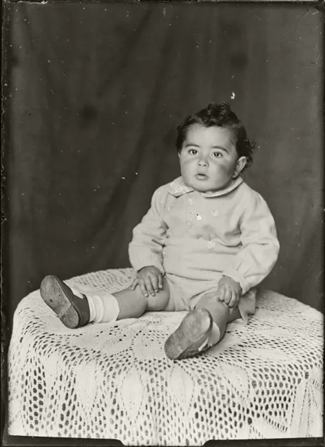 Imagen digitalizada a partir de negativo en placa de vidrio de formato rectangular y disposición vertical. Composición en base a cuerpo completo de figura infantil femenina sedente, en posición tres cuartos hacia la derecha con rostro y mirada en igual dirección. Está ubicada al centro de la imagen en primer plano.